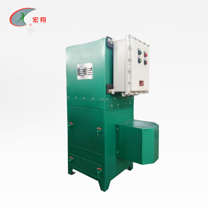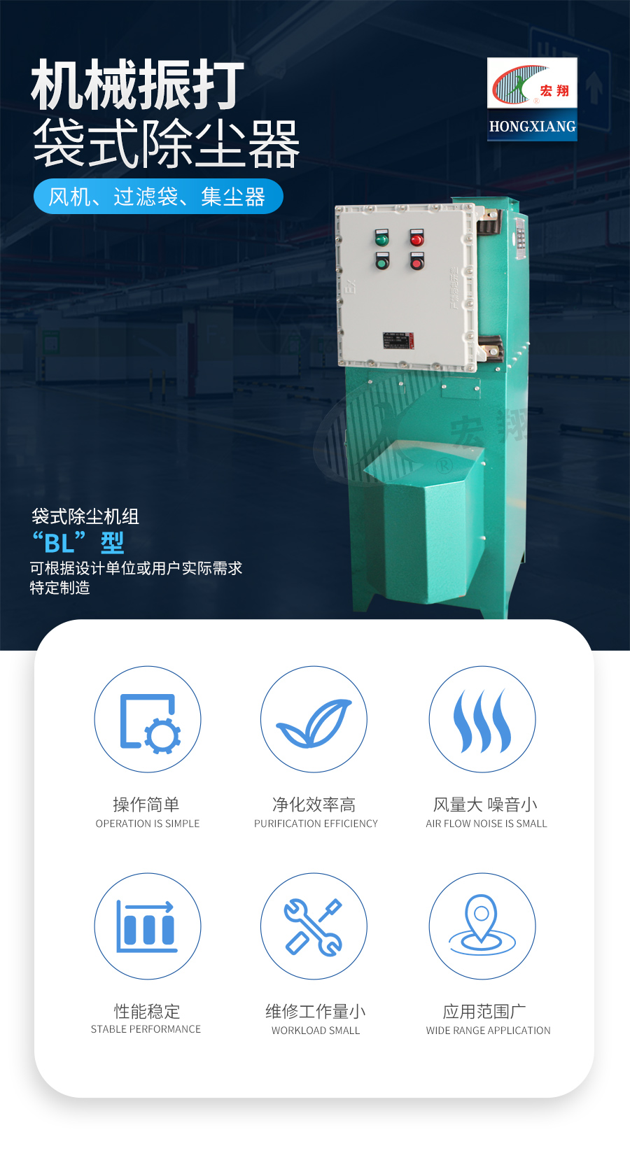 機械振打袋式除塵器工作原理:含塵氣體進入箱體,由扁布袋過濾器進行過濾,粉塵被阻留在濾袋外表面,已凈化的氣化通過過濾袋進入風機,由風機吸入直接排入室風(也可接管排至室外)。 隨著過濾時間的增加,濾袋外表面沾附的粉塵也不斷增加,從而影響到除塵效果采用自控控灰機構進行定時振打清灰或手控清灰機構停機后自動振打數十鐘,使沾在濾袋外表面的粉塵抖落下來。落到集塵容器(抽屜)中的粉塵由人工也清除。