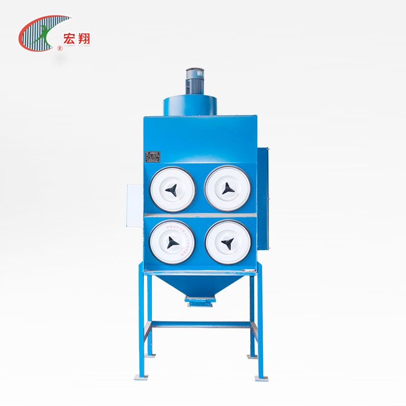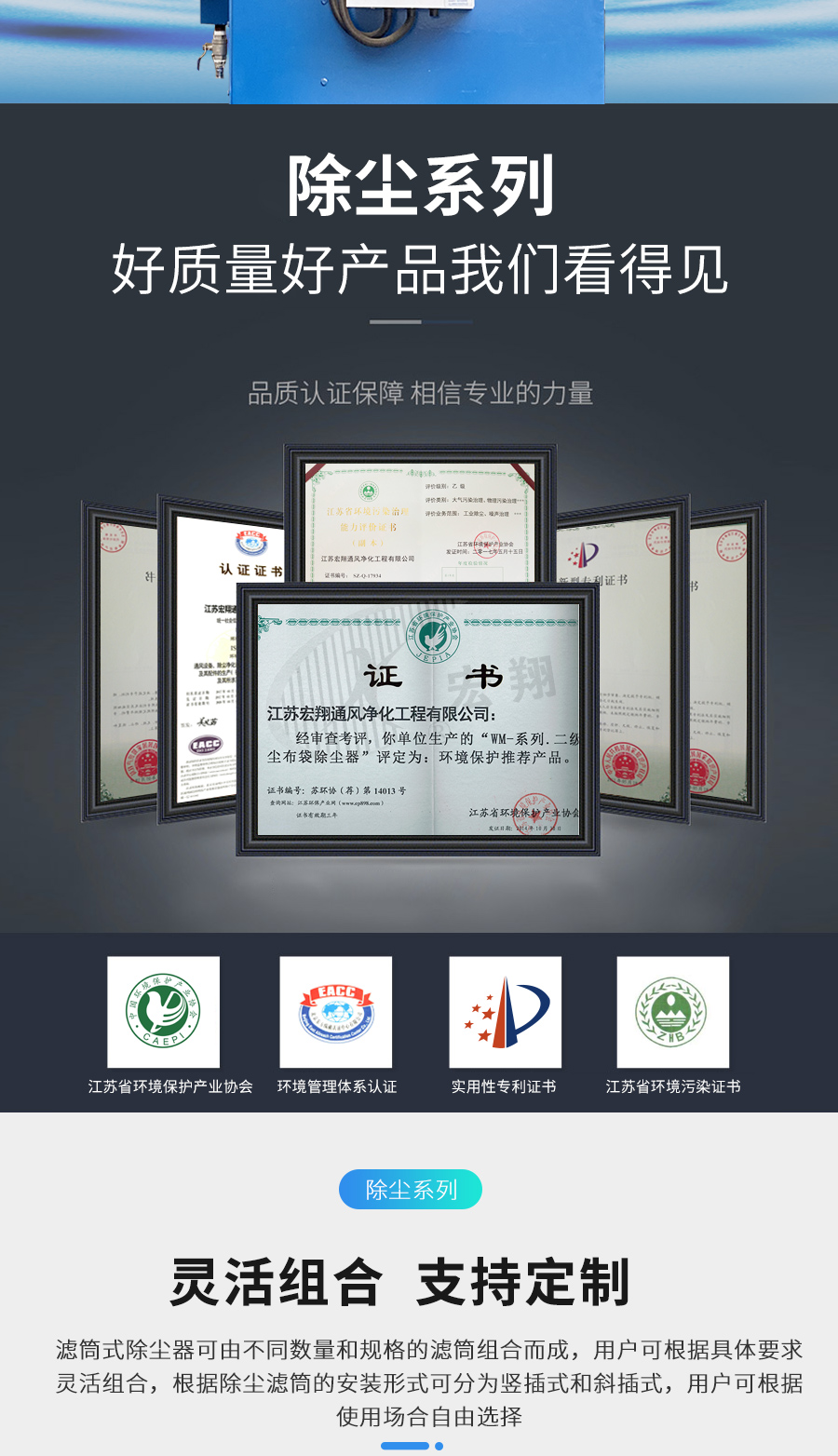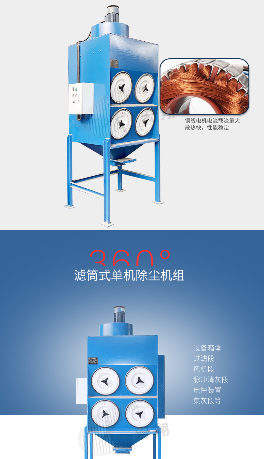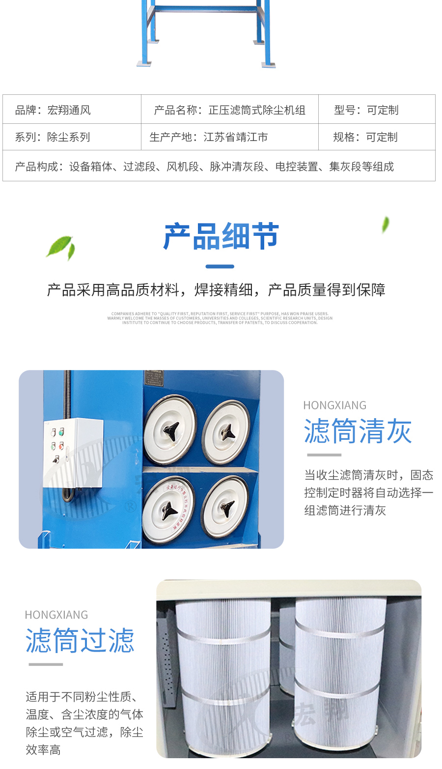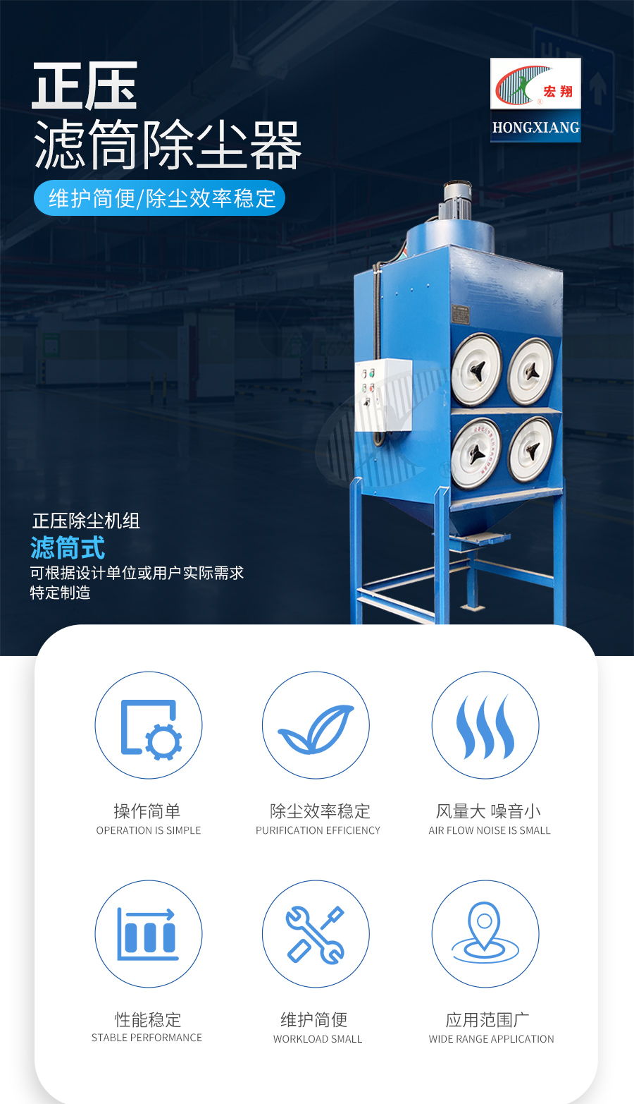正壓濾筒式除塵器的結構是由進風管、排風管、箱體、灰斗、清灰裝置、導流裝置、氣流分流分布板、濾筒及電控裝置組成,類似氣箱脈沖袋除塵結構。