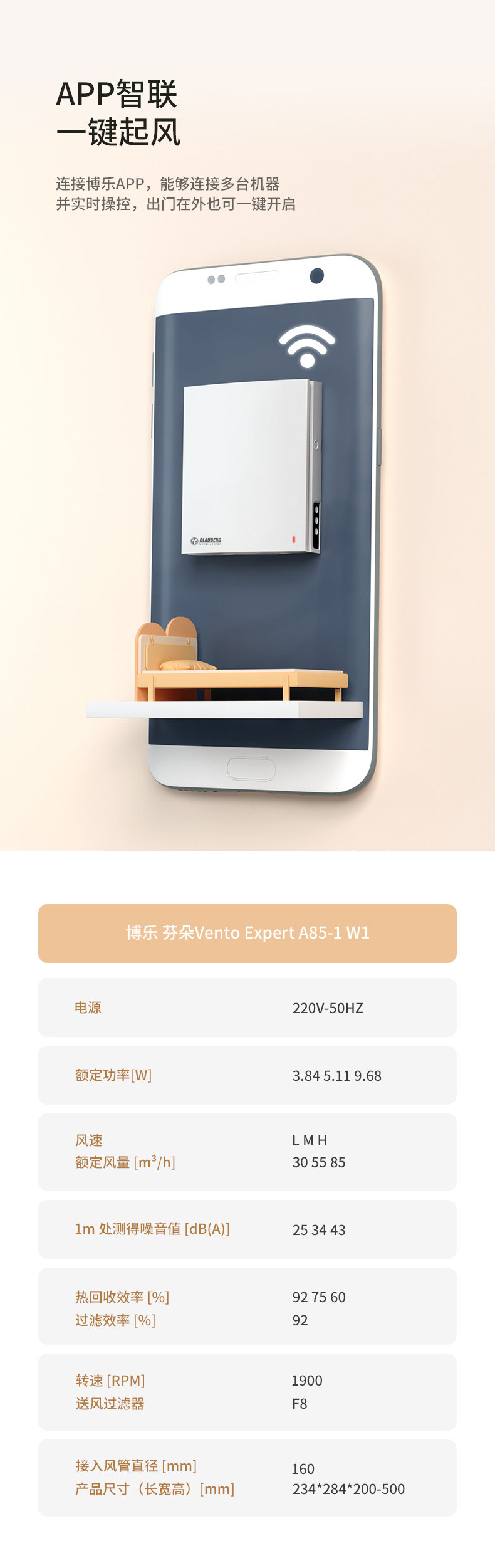 壁掛式新風系統(tǒng) Vento Expert A85(芬朵系列) 優(yōu)勢:恒溫恒氧、高效除霾、靜音舒適、A+節(jié)能認證、APP智能控制、防風防雨、無級調(diào)速、簡致外觀。 應(yīng)用場景 已裝修房屋 單個房間 辦公室 咖啡廳 會議室 適用面積10-20m2 相關(guān)下載 購買方式 產(chǎn)品參數(shù)