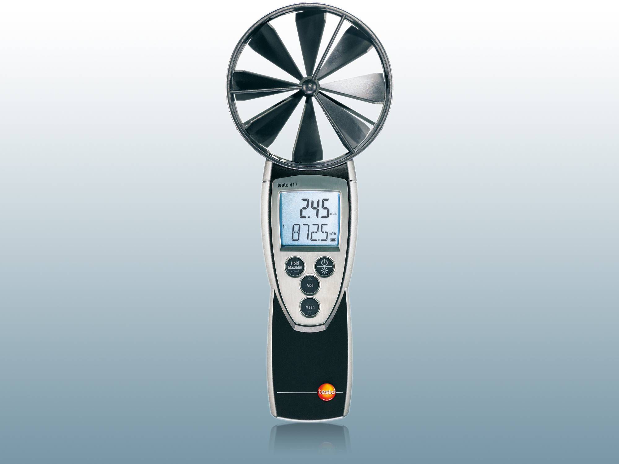 testo 417精密型風速儀,配置一體式葉輪風速/溫度探頭,直徑100mm,測量風速,風量和溫度。 直接顯示風量。只需輸入管道的截面積,即可精確計算出風量。可以快速切換至當前的溫度讀數。此外,還可以顯示氣流的方向。 儀器帶時間段和多點平均值計算功能,計算風量,風速和溫度的平均值。 用戶可選配風量罩,有助于更好的檢測格柵出風口和風閥處的風量。 儀器可以顯示最大值/最小值。