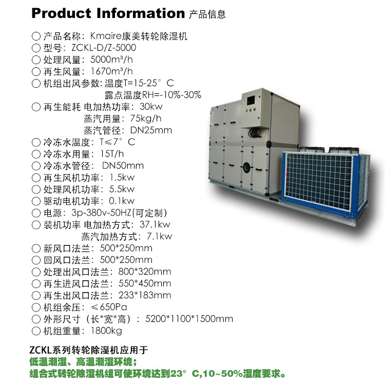 ZCKL系列轉(zhuǎn)輪除·濕空調(diào)機組使用時,用戶需提供T≤7°C的冷凍水;或由本公司隨機匹配提供相對冷量負荷的制冷機組。