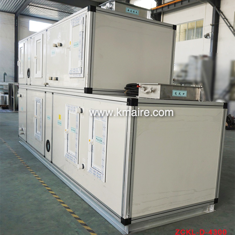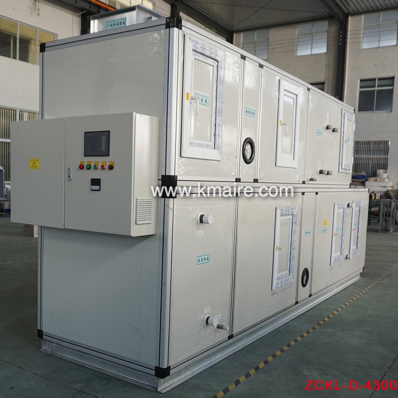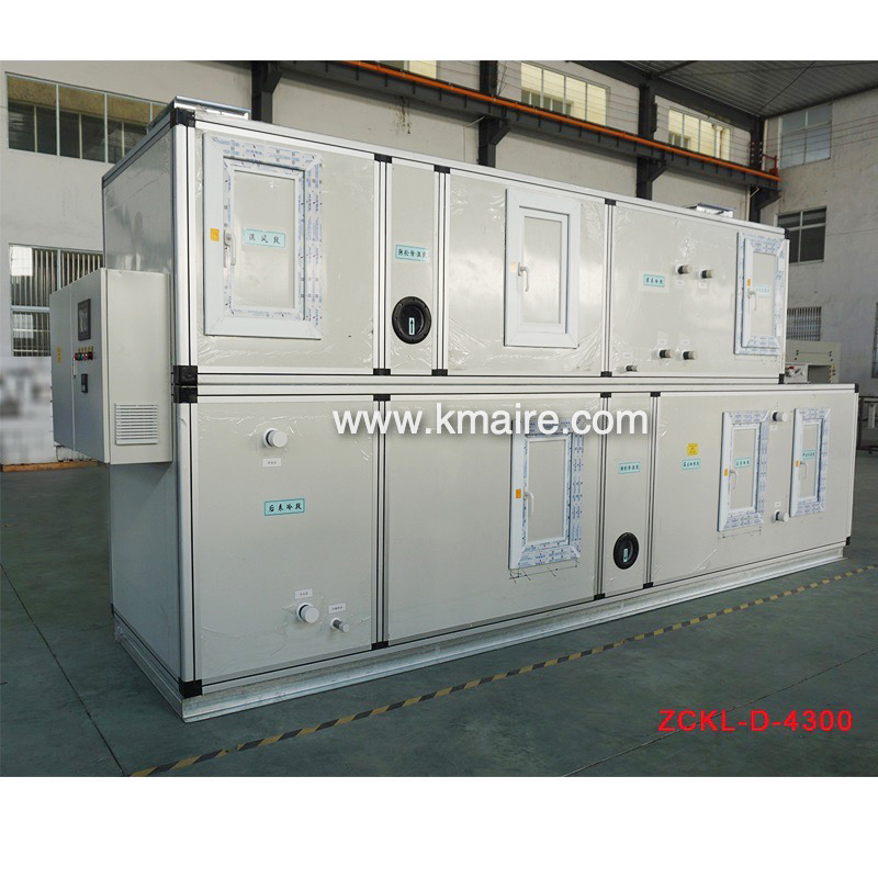 1、ZCKD低露點轉輪除濕機組主要由初效過濾段、新風表冷段、回風段、混合表冷段、超級硅膠或分子篩轉輪除濕段、冷吹再生區、后表冷段、中效過濾段、均流段、送風段和PLC電氣控制系統組成;