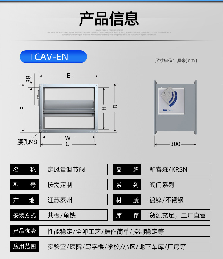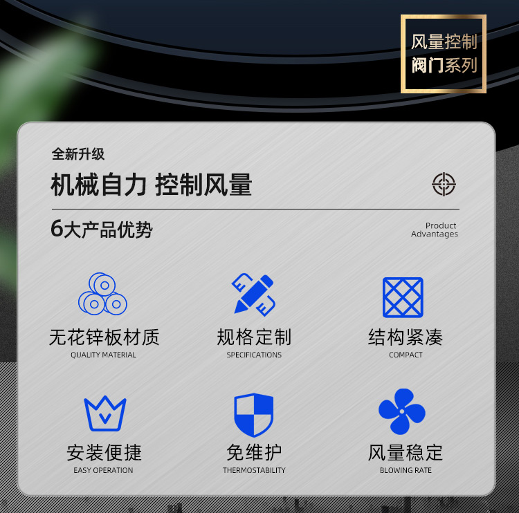 酷睿森EN型風量調節器為機械自動式結構,是為定風量系統中的 風量控制而開發的,適用于送風和排風。 EN:風量調節器,規格100*100至1200*600 每臺調節器出廠前都設置到一個參考風量,并通過氣流性能測試。無需任何工具,通過外部的刻度盤就可方便地設定所需風量。為了簡化安裝,可以根據調節器的公稱尺寸來訂貨,然后在隨后的調試過程中方便精確地設定所需風量。 風量調節器的運行無需外部供電,它依靠一塊靈活的閥片在空氣動力的作用下,能將風量在整個壓差范圍內恒定在設定值